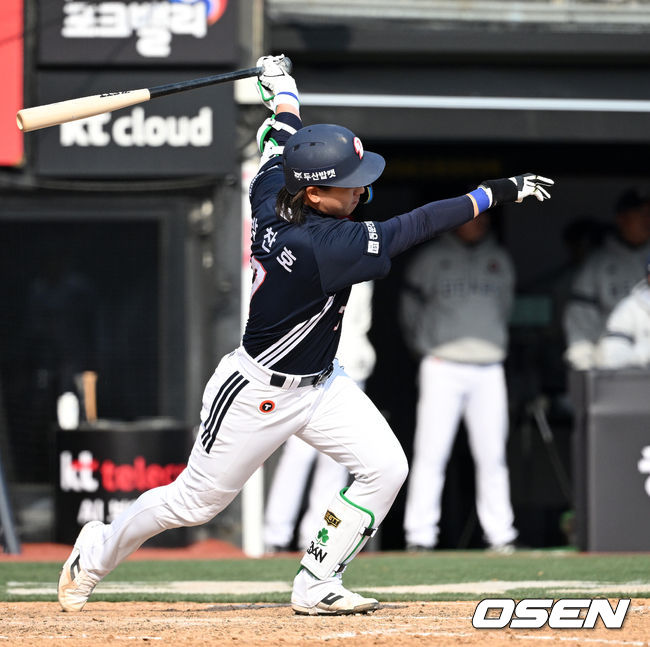 23일 경기도 수원 KT위즈파크에서 2026 신한 SOL KBO리그 시범경기 KT 위즈와 두산 베어스의 경기가 열렸다. 시범경기는 24일까지 각 팀당 12경기씩 총 60경기가 펼쳐졌다. 9회초 무사에서 두산 박찬호가 좌전안타를 쳤다.
