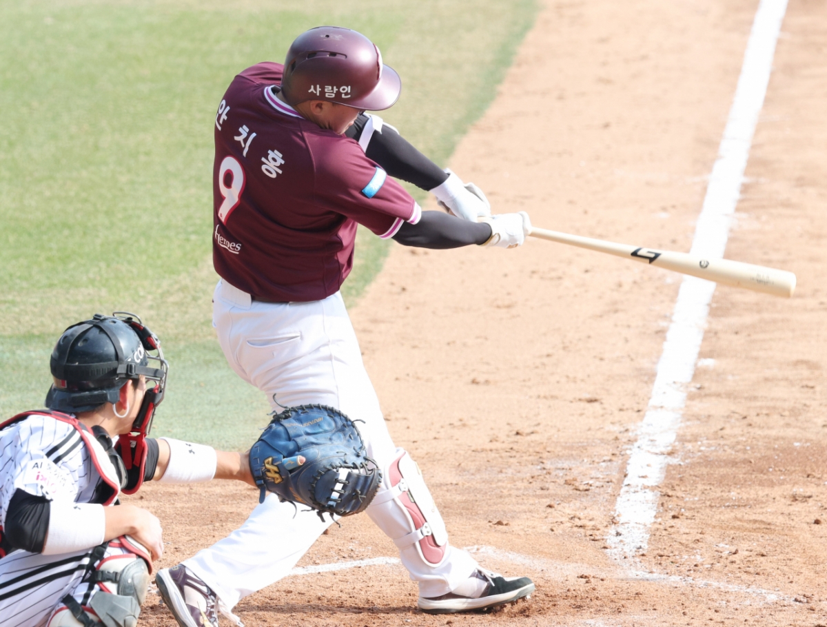키움 안치홍이 9회초 무사 1루에서 내야안타를 날리고 있다.