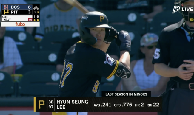 피츠버그 중계진은 “한국 서울 출신의 18세 선수로 지난해 도미니카 섬머리그에서 뛰었다. 섬머리그에서 볼넷이 삼진보다 많았는데 여기에서도 볼넷을 골라나갔다”고 말했다. 지난해 도미니카 섬머리그에서 이현승은 볼넷 38개, 삼진 32개를 기록했는데 장점인 선구안을 이날 타석에서도 잘 보여줬다. 이어 무관심 도루로 2루에 진루했지만 후속타가 터지지 않아 이현승은 잔루로 남았다.