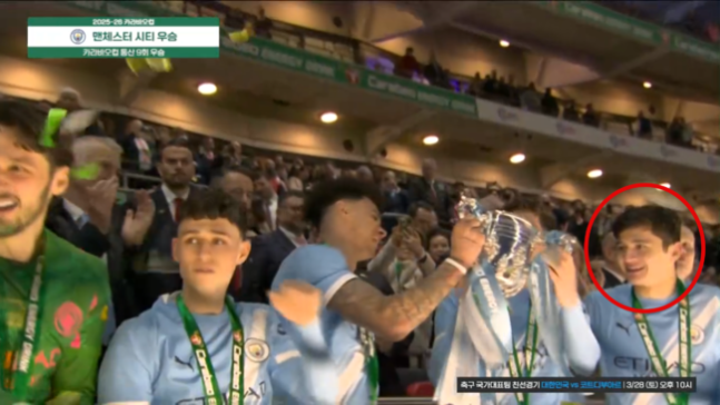흐름이 끊긴 건 후사노프의 순서였다. 존 스톤스가 트로피를 들어 올린 뒤 그에게 건네려는 순간, 중계 화면은 갑자기 전환됐다. 전체 관중석을 비추는 장면으로 바뀌었다. 그리고 곧바로 엘링 홀란이 트로피를 들자 다시 선수 클로즈업으로 돌아왔다.