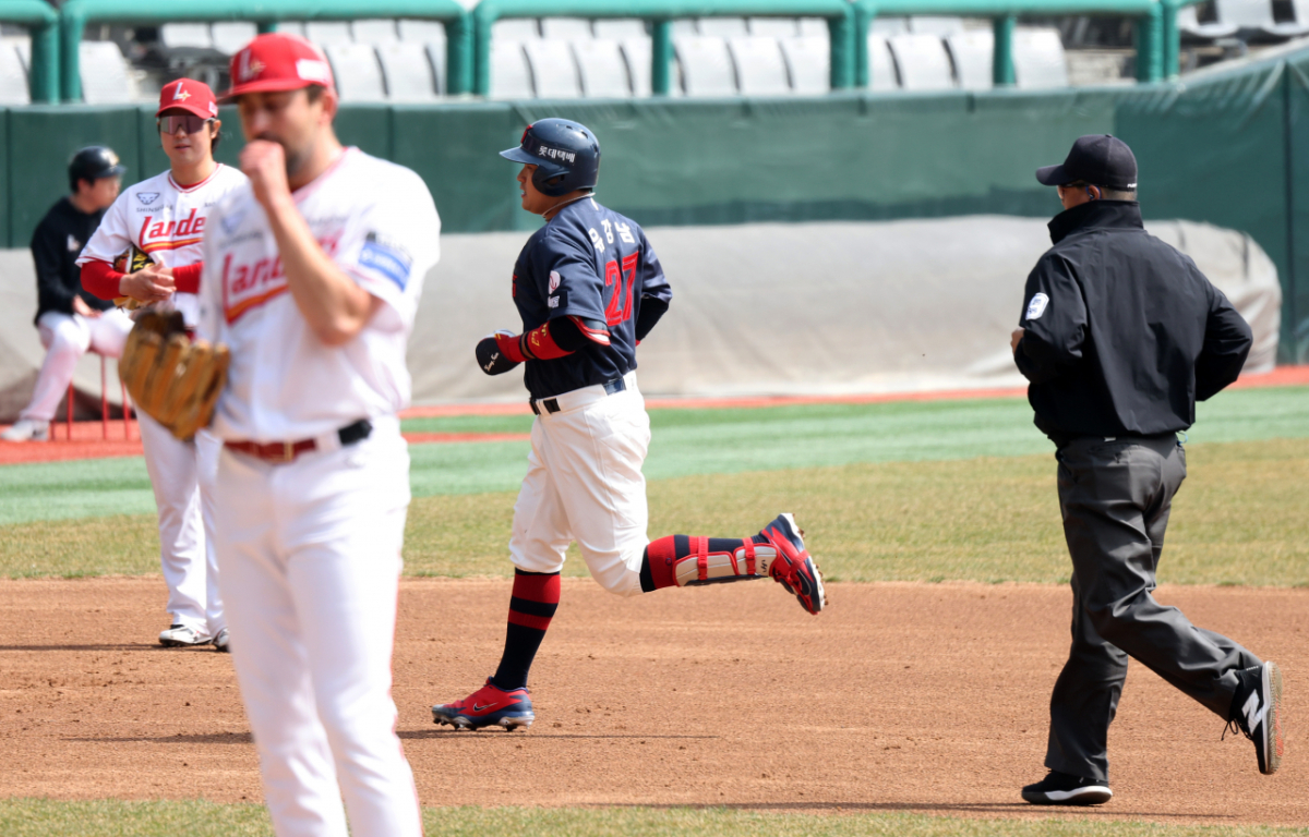 롯데 유강남이 24일 랜더스필드에서 열린 1016 프로야구 시범경기 SSG랜더스와 롯데자이언츠 경기 2회초 1사후 선제솔로홈런을 터트렸다. 유강남은 홈런을 터트린 후 홈인했다. 이 경기는 2026년 3월 24일에 진행되었다.