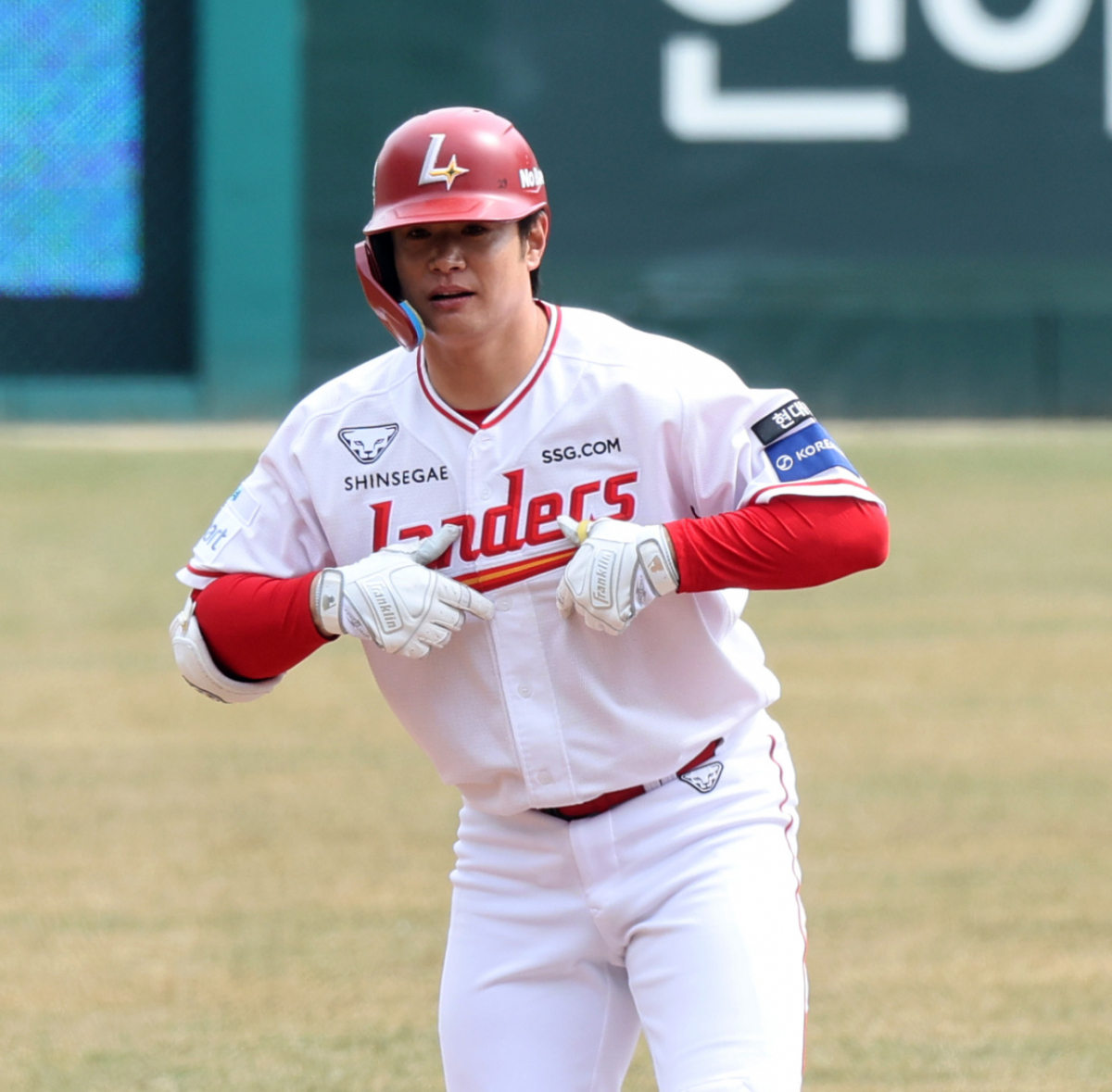 SSG 4번타자 김재환이 24일 랜더스필드에서 열린 1016 프로야구 시범경기 SSG랜더스와 롯데자이언츠 경기 4회말 1사 2루에서 1타점 2루타로 출루하고 있다. 2026.03.24.