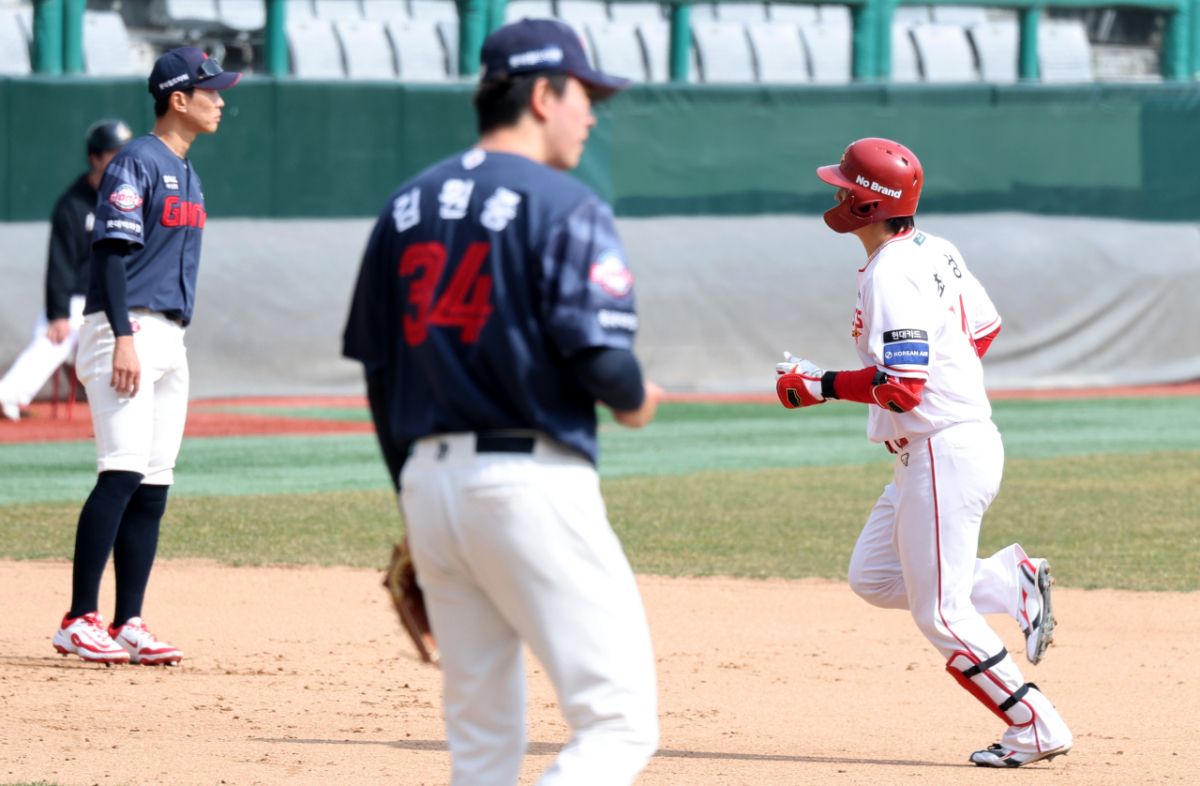 SSG 3번타자 최정이 24일 랜더스필드에서 열린 1016 프로야구 시범경기 SSG랜더스와 롯데자이언츠 경기 7회말 김원중을 상대로 투런홈런을 터트린 후 홈인하고 있다. 2026.03.24.