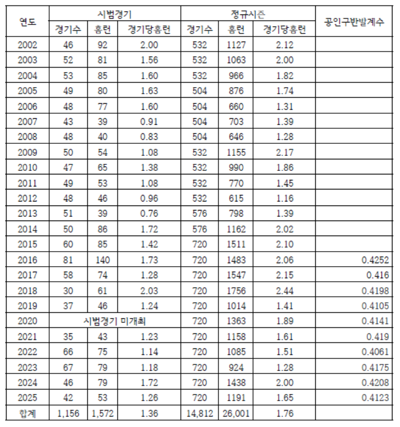이 표를 보면 몇 가지 흐름이 분명하게 드러난다. 2002년부터 2025년까지 시범경기와 정규시즌의 경기당 홈런은 각각 평균 1.36개와 1.76개로 나타났다. 시범경기에서 경기당 홈런이 높았던 시즌은 정규시즌에서도 홈런이 증가하는 경향을 보인다. 2014년, 2016년, 2018년, 2024년이 대표적인 사례다. 반대로 시범경기 홈런이 낮았던 시즌(2007~2008년, 2012~2013년, 2022~2023년)에는 정규시즌에서도 장타 생산이 줄어드는 흐름이 나타났다.