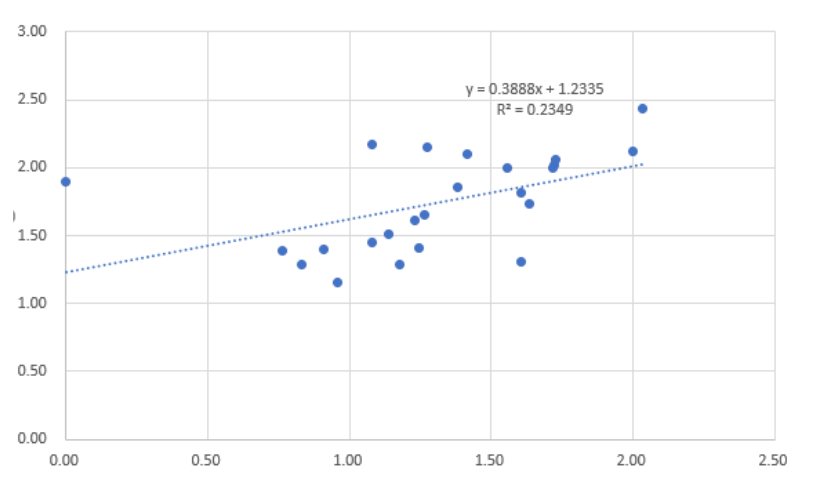다만 상관관계의 강도는 크지 않다. 결정계수(R²)가 약 0.235라는 것은 정규시즌 홈런 변동의 약 23.5%만이 시범경기 데이터로 설명된다는 의미다. 즉, '약한 상관관계'에 해당한다.