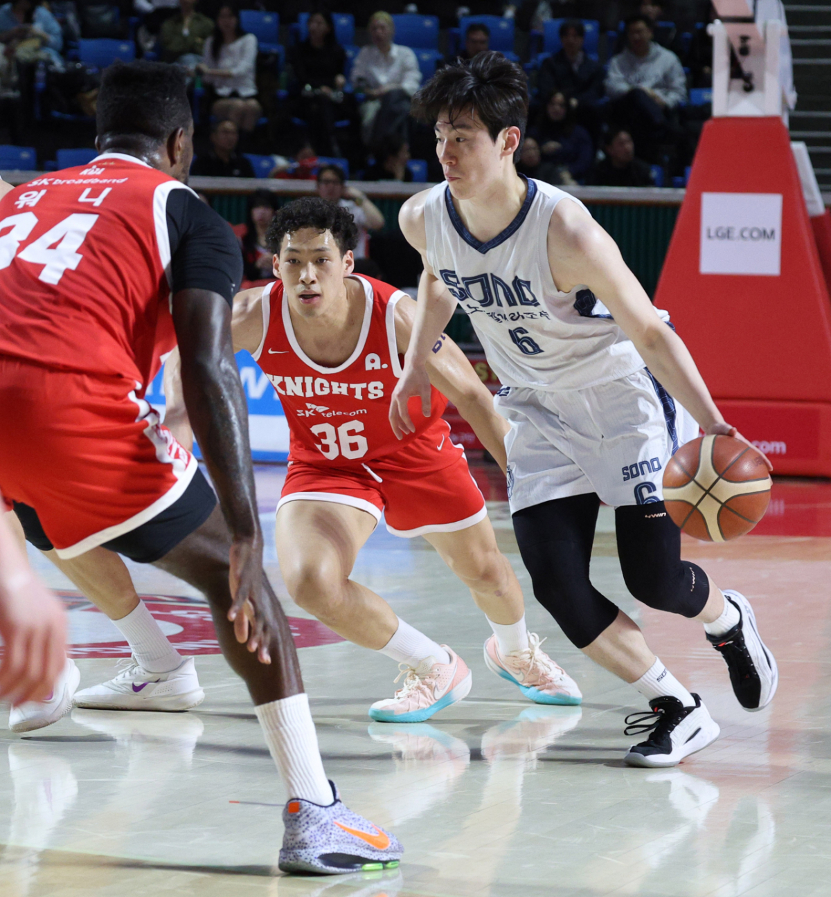 소노 이정현이 SK 에디 다니엘과 위니를 제치고 중앙 돌파를 시도하고 있다.