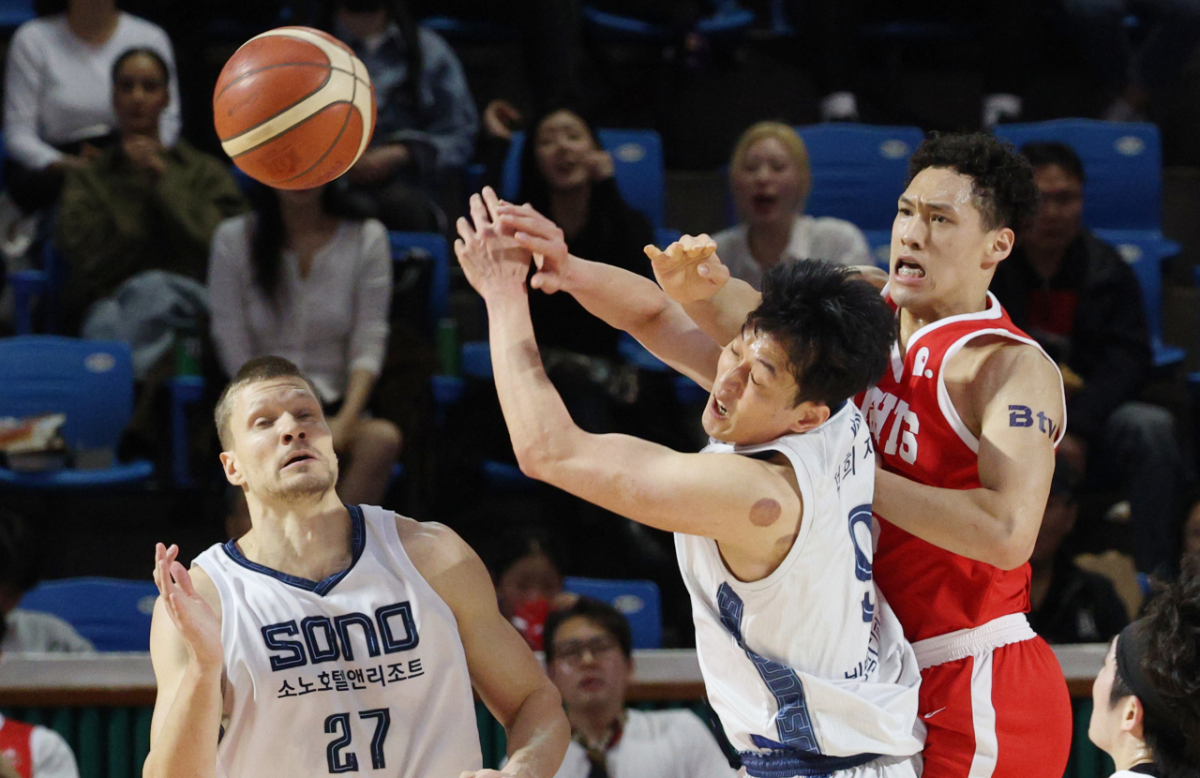 25일 서울 잠실학생체육관에서 2025-2026 KBL 프로농구 서울 SK 대 고양 소노 경기가 열렸다. SK 에디 다니엘이 소노 정희재에게 패스된 공을 쳐냈다. 에디 다니엘이 힘으로 공을 저지했다.