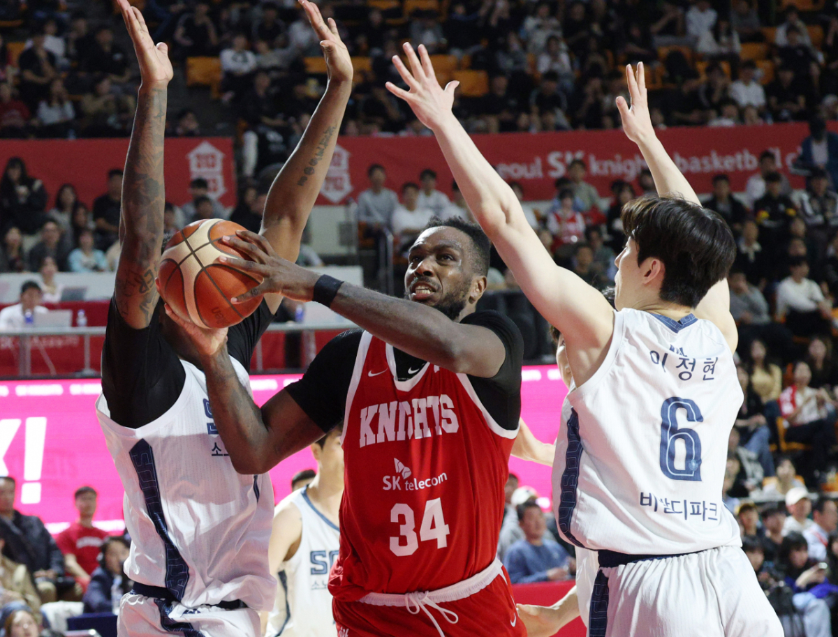 SK 자밀 워니가 소노 나이트와 이정현을 제치고 골밑슛을 시도하고 있다.