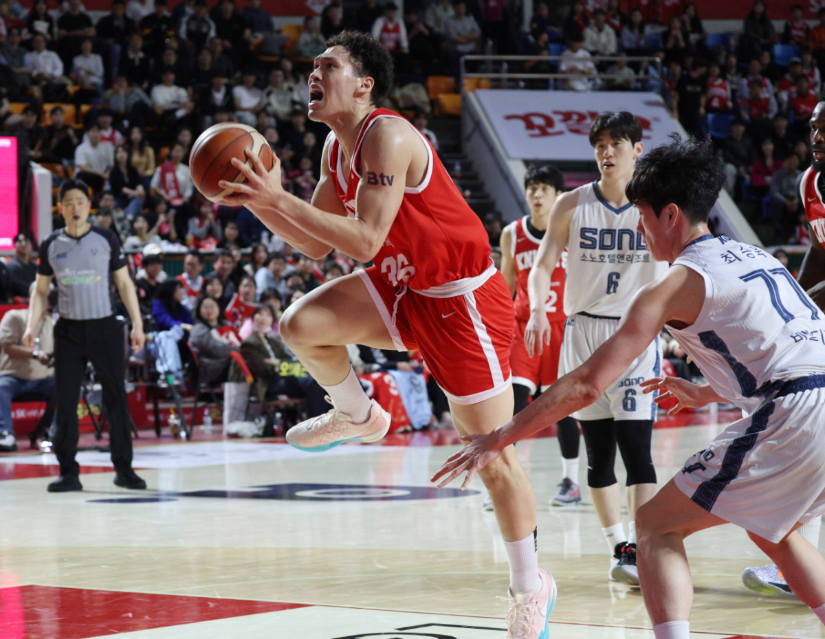 SK 에디 다니엘이 소노 최승욱을 제치고 골밑슛을 시도하고 있다.