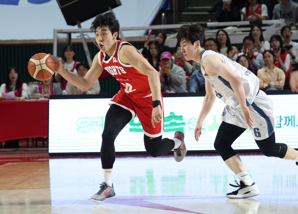 SK 오재현이 소노 이정현을 제치고 중앙 돌파를 시도하고 있다.
