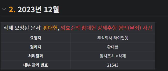황대헌의 소속사 라이언앳은 최근 '나무위키' 내 관련 문서들에 대해 임시조치를 요청했다. 대상은 '황대헌/논란 및 사건사고'와 '임효준 강제추행 누명 사건' 문서다. 사유는 허위사실. 이해욱 대표가 직접 요청에 관여한 것으로 알려졌다.