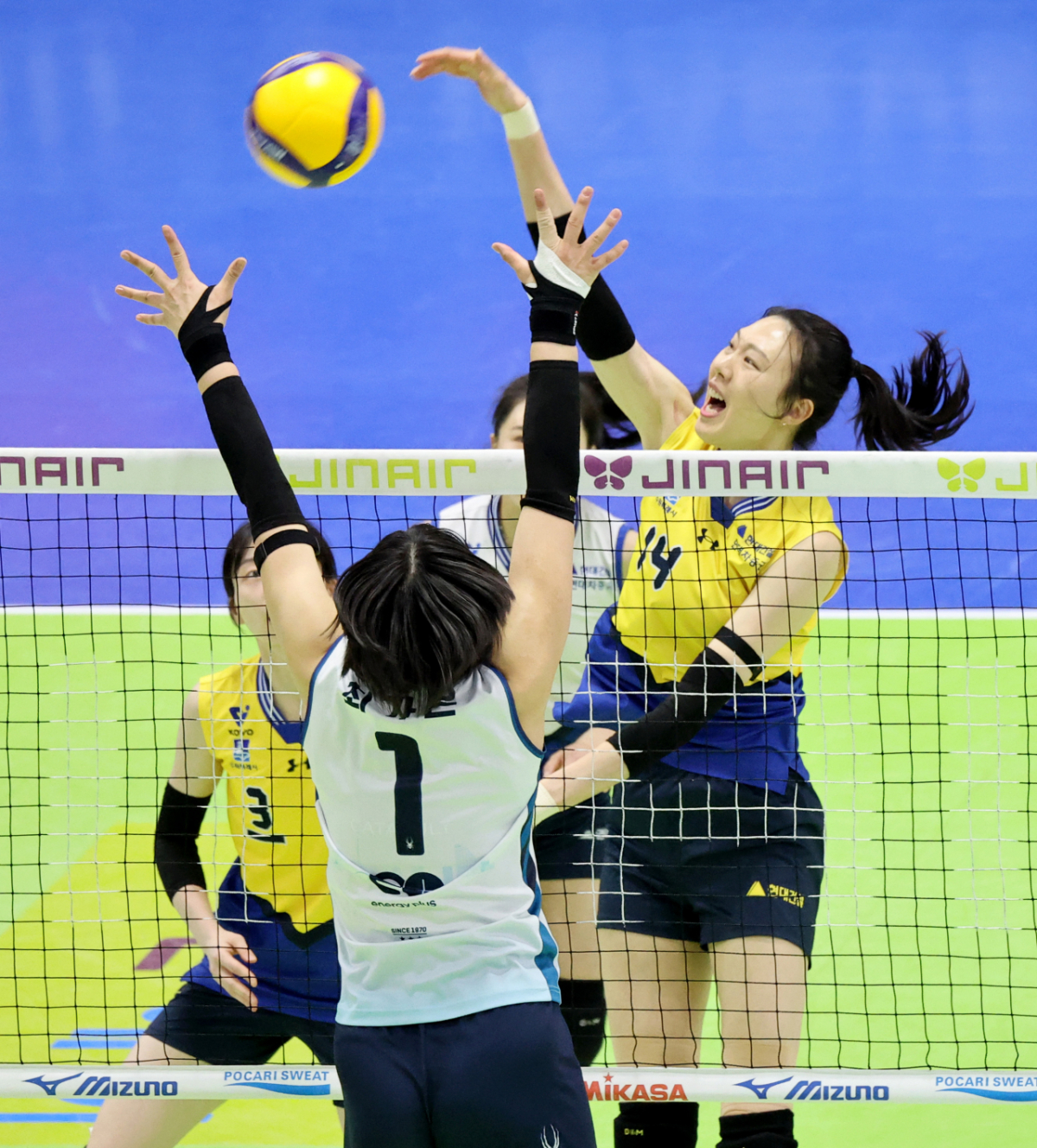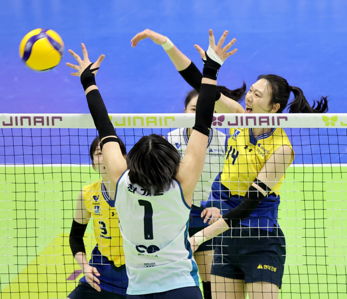 현대 양효진이 26일 수원체육관에서 열린 2025-2026 진에어 V리그 현대건설과 GS칼텍스 플레이오프에서 공격을 했다. 양효진은 최가은을 피해 공격을 시도했다. 이 경기는 2026년 3월 26일에 진행되었다.