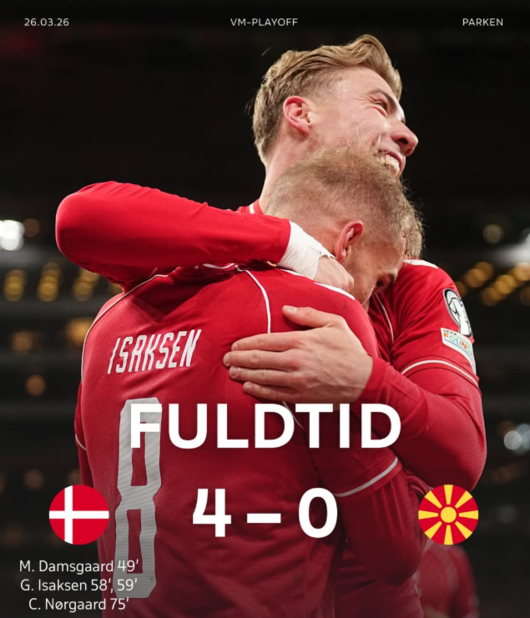 덴마크는 27일(이하 한국시간) 코펜하겐 파르켄에서 열린 유럽 예선 플레이오프 패스D 준결승에서 북마케도니아를 4-0으로 완파했다. 결승행이다.