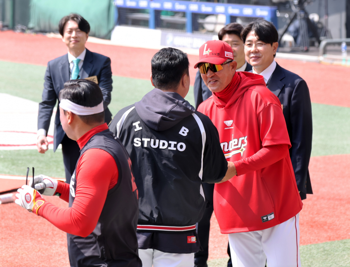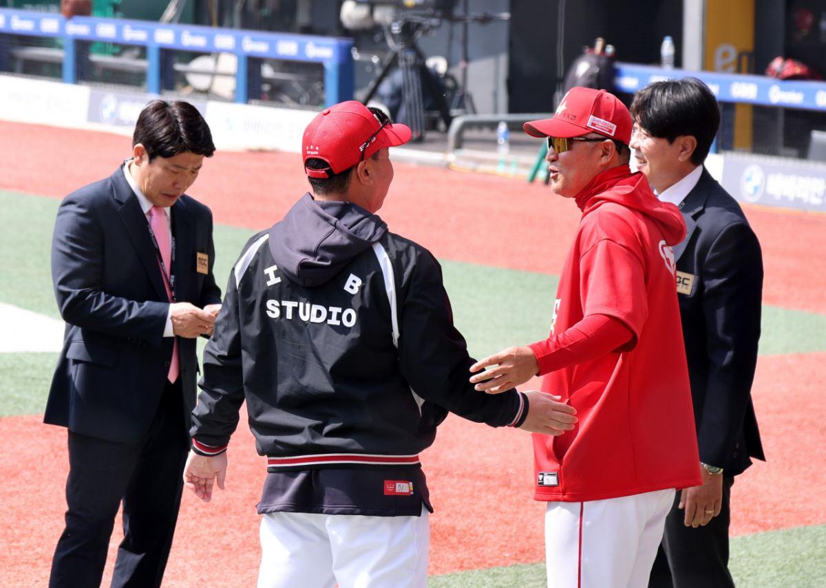 SSG랜더스 이웅용 감독이 28일 인천SSG랜더스필드에서 열리는 2026 프로야구 SSG랜더스와 KIA타이거즈 개막경기를 앞두고 그라운드에서 이범호 감독과 인사를 나누고 있다. 2026.03.28.