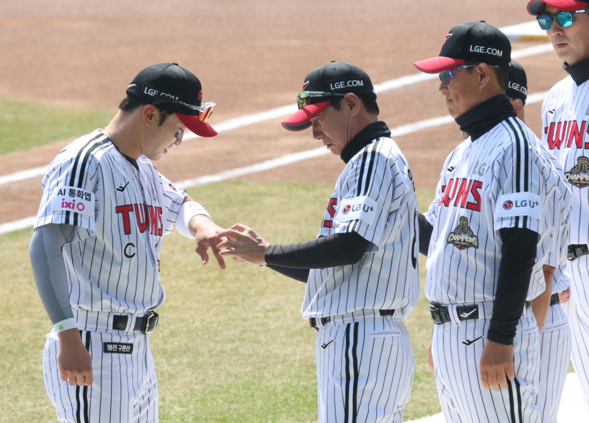 28일 서울 잠실야구장에서 2026 신한 SOL Bank KBO리그 공식 개막전 LG 트윈스 대 KT 위즈 경기가 열렸다. 경기 전 열린 우승 반지 전달식에서 LG 주장 박해민이 김인석 대표로부터 우승 반지를 수여했다. 박해민은 수여받은 우승 반지를 염경엽 감독에게 보여주었다.