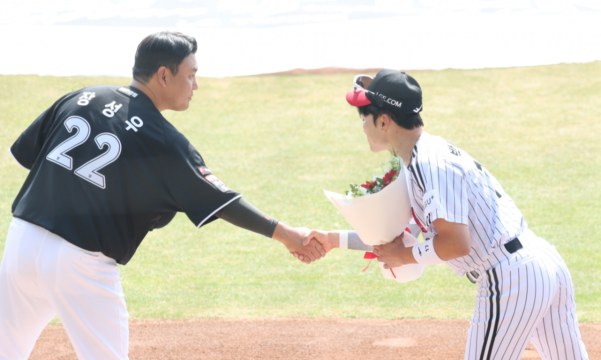 2026 신한 SOL Bank KBO리그 공식 개막전 LG 트윈스와 KT 위즈 경기가 28일 서울 잠실야구장에서 열렸다. KT 주장 장성우와 LG 주장 박해민이 개막식 후 악수를 했다. 두 선수는 선전을 다짐했다.