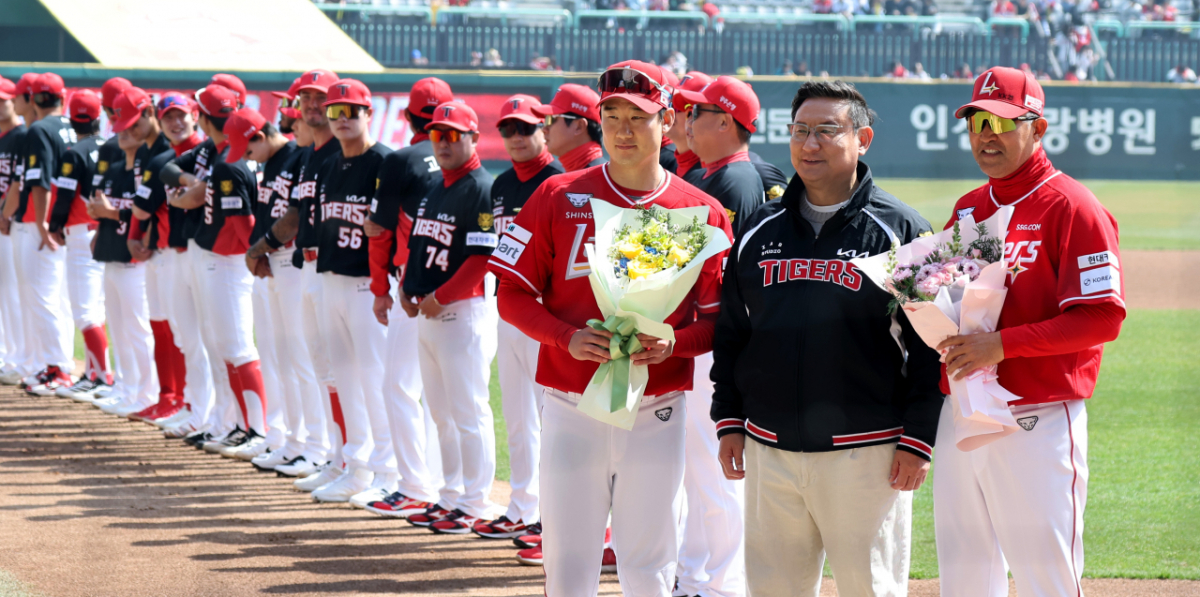 28일 인천SSG랜더스필드에서 열리는 2026 프로야구 SSG랜더스와 KIA타이거즈 개막경기에서 기아 이범호 감독이 꽃다발을 받았다. 이범호 감독은 김아 심재학 단장으로부터 오태곤과 함께 꽃다발을 받았다. 이 장면은 2026년 3월 28일에 포착되었다. 기아 이범호 감독이 28일 인천SSG랜더스필드에서 열리는 2026 프로야구 SSG랜더스와 KIA타이거즈 개막경기에서 김아 심재학 단장으로부터 오태곤과 함께 꽃다발을 받고 있다. 2026.03.28. 독자들의 PICK! "자습 때 둘이 사라져"...홍서범 아들 불륜, 학생들 잇단 제보 월 700만원 벌어도..."생활비 30만원, 한국인 남편 짠돌이" 8살 차이 장모·사위, 금단의 관계로...회복 불가 외도 사례 "며느리 불륜" 공방에...신혼집에 몰카 설치한 류중일 전 사돈