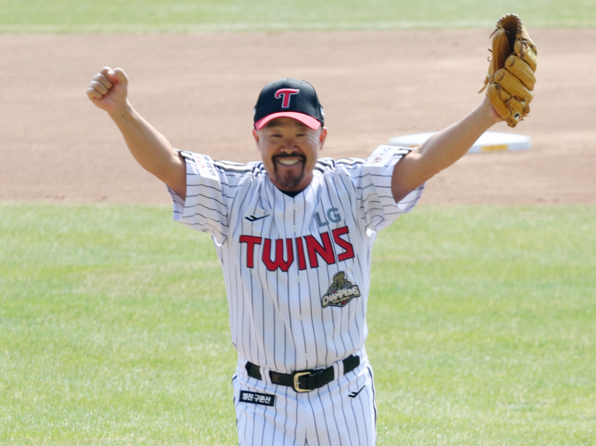 LG 김용일 트레이닝 코치가 LG 승리기원 시구를 한 후 두팔을 번쩍 들고 있다.