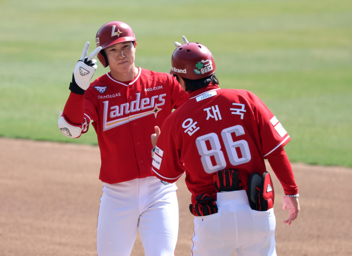랜더스 박성한이 28일 인천SSG랜더스필드에서 열리는 2026 프로야구 SSG랜더스와 KIA타이거즈 개막경기 1회말 안타로 출루하고 있다. 2026.03.28.