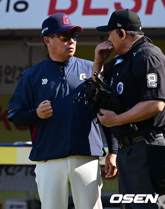 5회말 삼성 선두타자 이재현의 타석 때 롯데 김태형 감독이 심판에게 어필하고 있다. 2026.03.28 /[email protected]