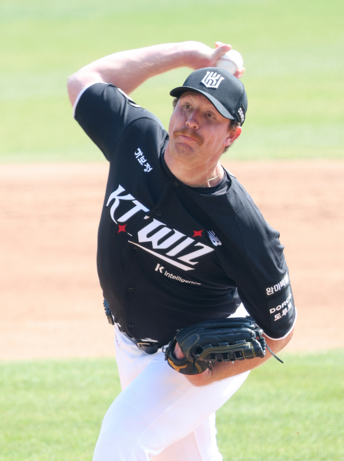 2026 신한 SOL Bank KBO리그 공식 개막전 LG 트윈스 대 KT 위즈 경기가 28일 서울 잠실야구장에서 열렸다. KT 선발 사우어가 역투했다. 기사는 사우어 선수의 역투 모습을 담은 포토 기사이다.