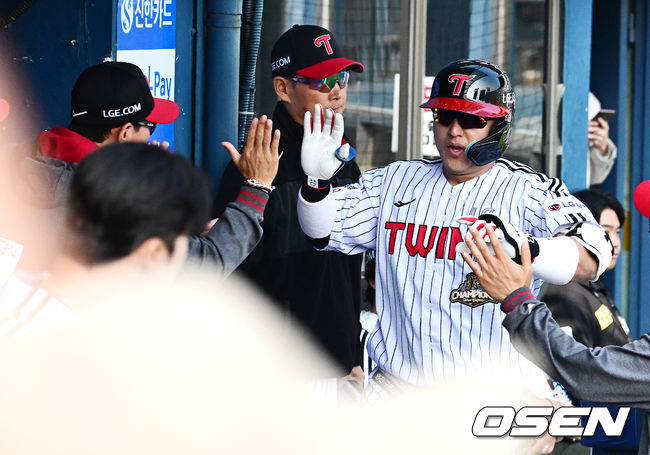 28일 서울 잠실야구장에서 2026 신한 SOL KBO리그 개막전 LG 트윈스와 KT 위즈의 경기가 열렸다. 이날 LG는 요니 치리노스, KT는 맷 사우어를 선발로 내세웠다. 5회말 2사에서 LG 박동원이 좌월 솔로포를 날리며 염경엽 감독과 하이파이브를 했다.