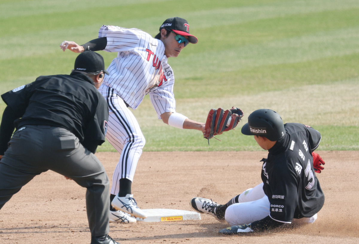 28일 서울 잠실야구장에서 2026 신한 SOL Bank KBO리그 공식 개막전 LG 트윈스와 KT 위즈 경기가 열렸다. KT의 최원준 선수가 5회초 2사 1루 상황에서 2루 도루를 시도했다. 하지만 LG의 2루수 신민재 선수에게 태그아웃되었다.