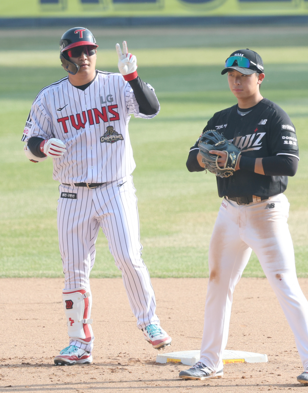 LG 문보경이 7회말 무사 1루에서 1타점 우익선상 2루타를 날리고 출루한 후 세리머니를 하고 있다.