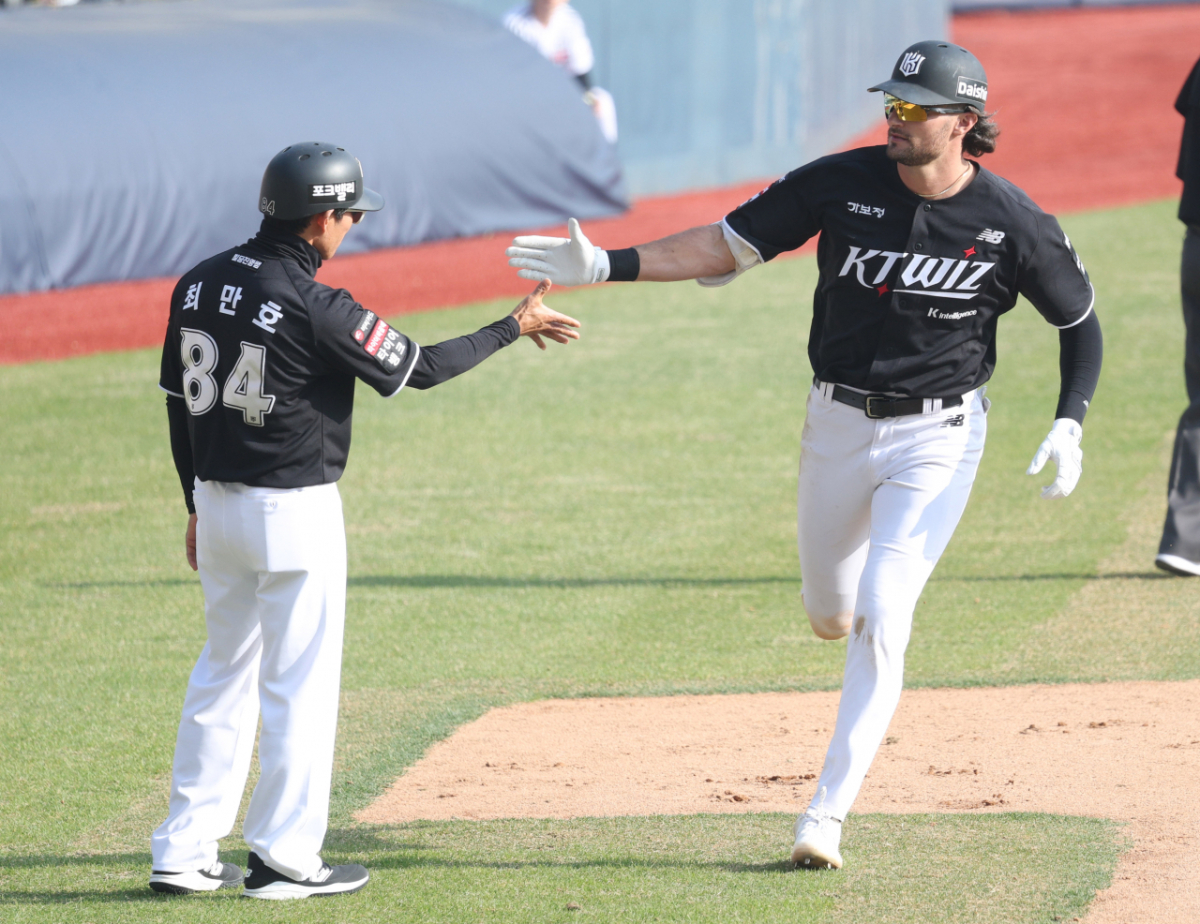 KT 힐리어드가 7회초 2사 2루에서 우월 2점 홈런을 닐리고 홈인하고 있다.