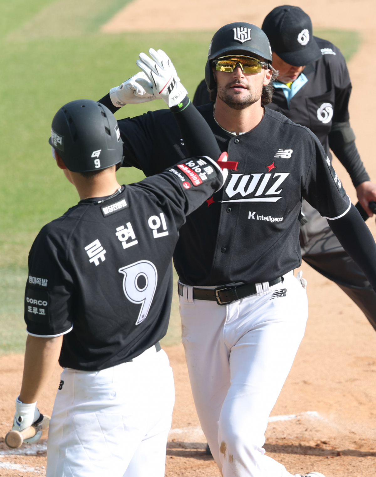 KT 힐리어드가 7회초 2사 2루에서 우월 2점 홈런을 닐리고 홈인하고 있다.