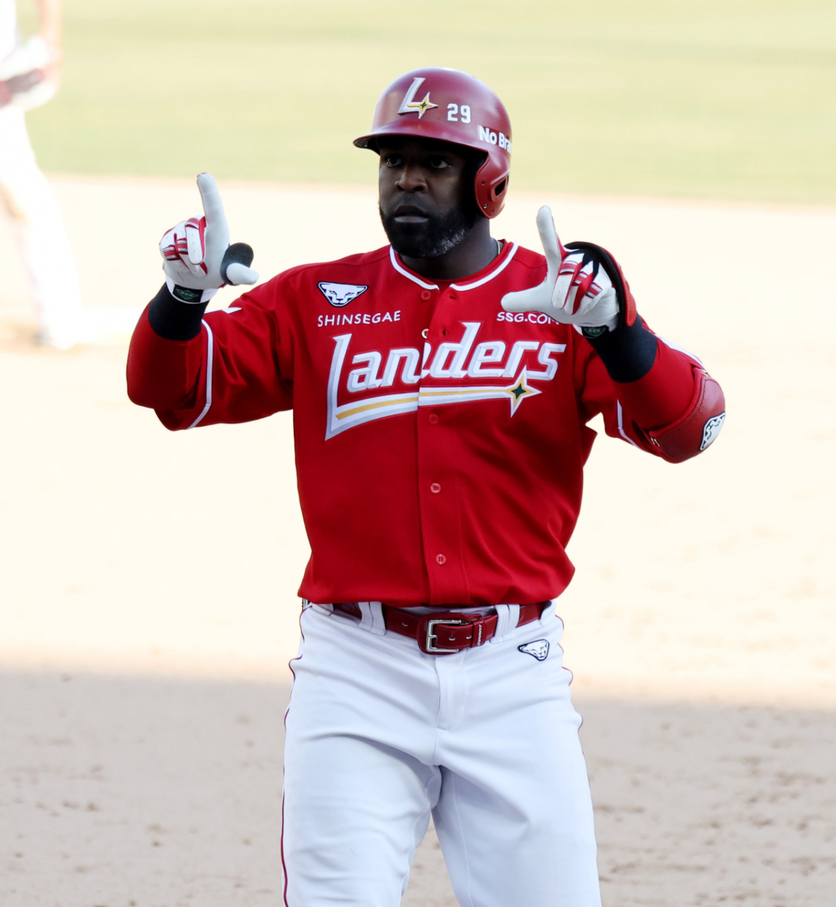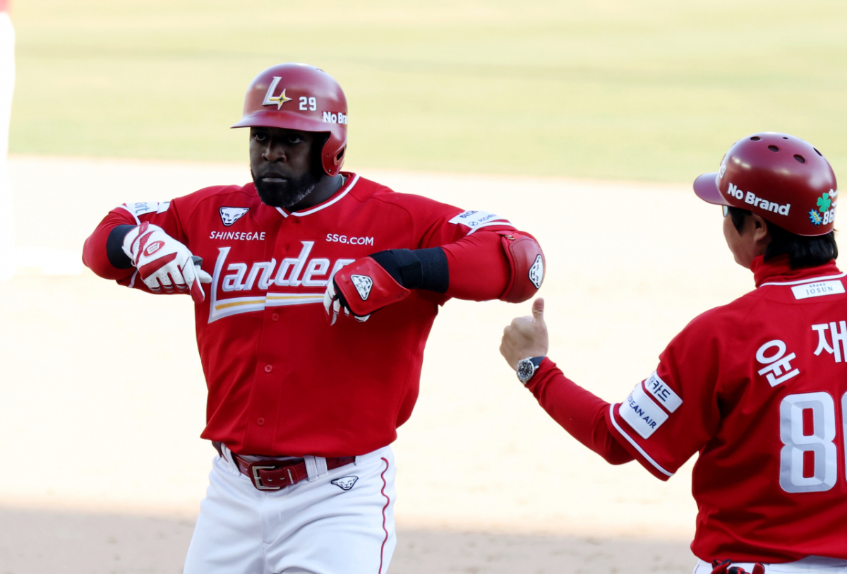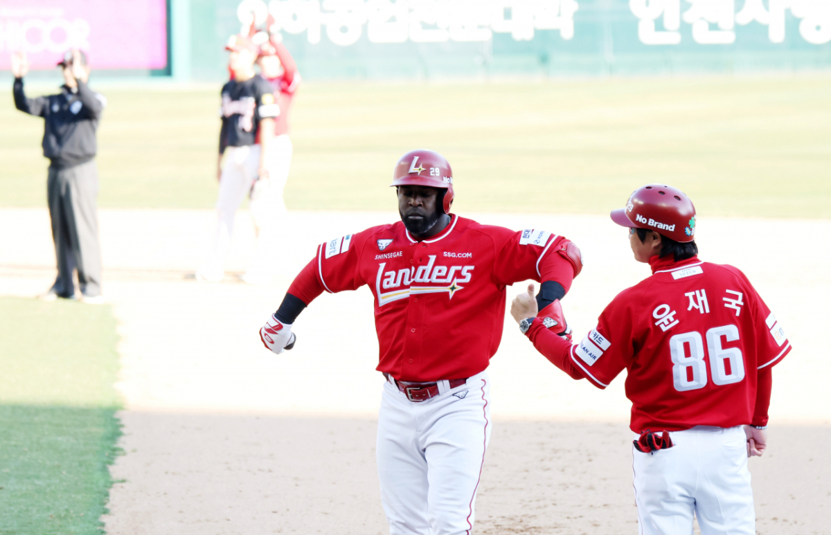 랜더스 에레디아가 28일 인천SSG랜더스필드에서 열리는 2026 프로야구 SSG랜더스와 KIA타이거즈 개막경기 9회말 1사 1,2루에서 1타점 적시타를 터트린 후 환호하고 있다.. 2026.03.28.