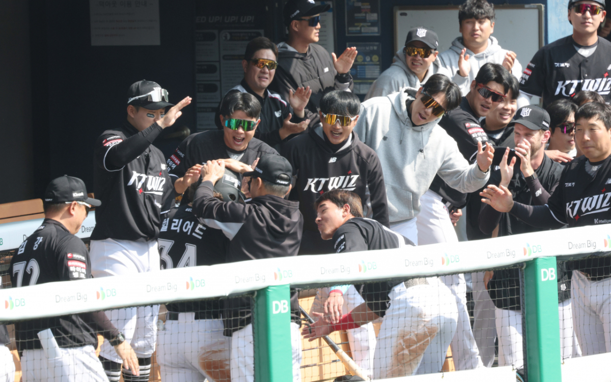 KT 1회초 2사 1,2루에서 2루주자 힐리어드가 이정훈의 적시타 때 득점한 후 더그아웃에서 동료들의 환영을 받고 있다.
