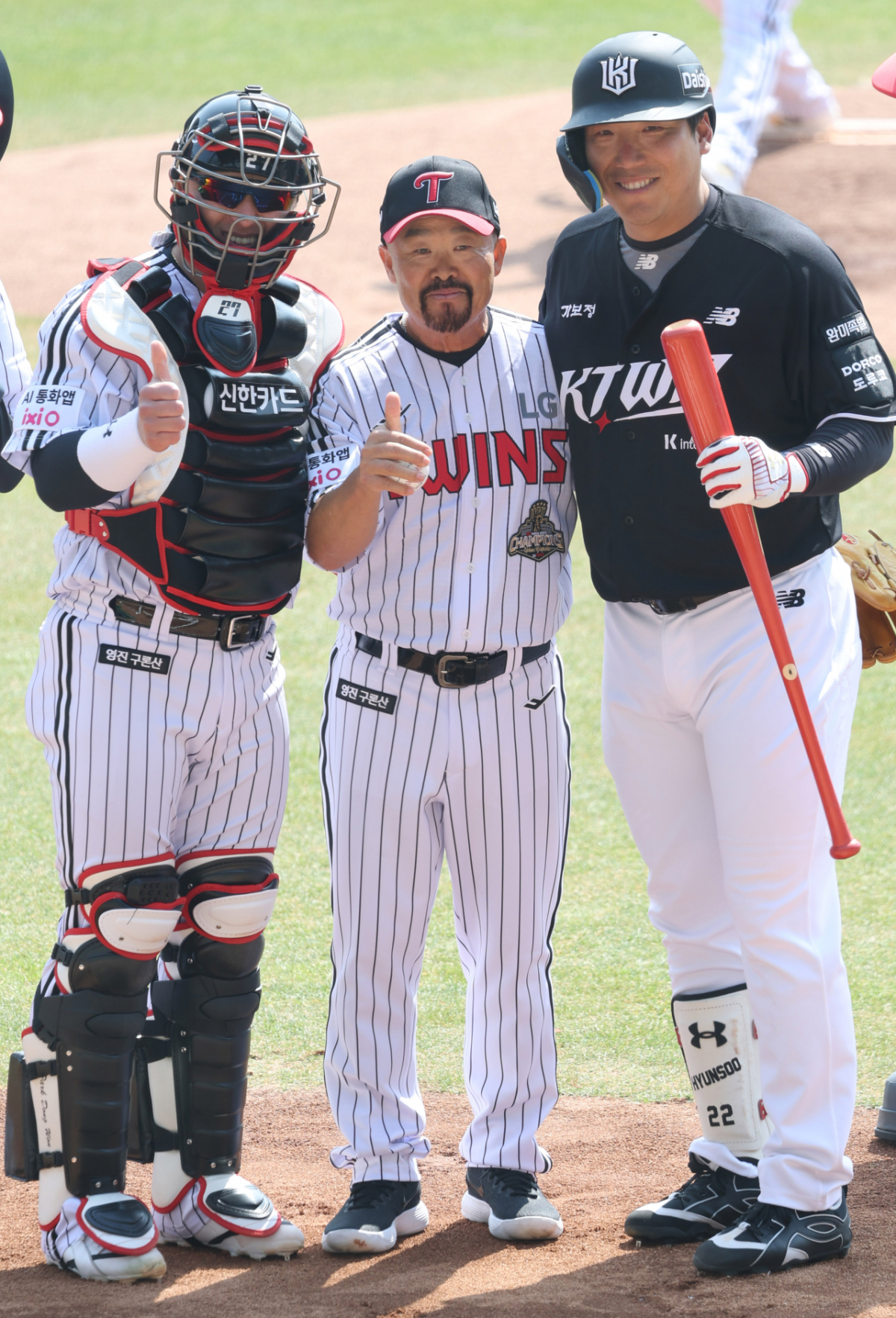 KT 유니폼을 입고 친정팀을 찾은 김현수는 LG 김용일 코치의 시구에 시타로 나서 존경심을 표했다.