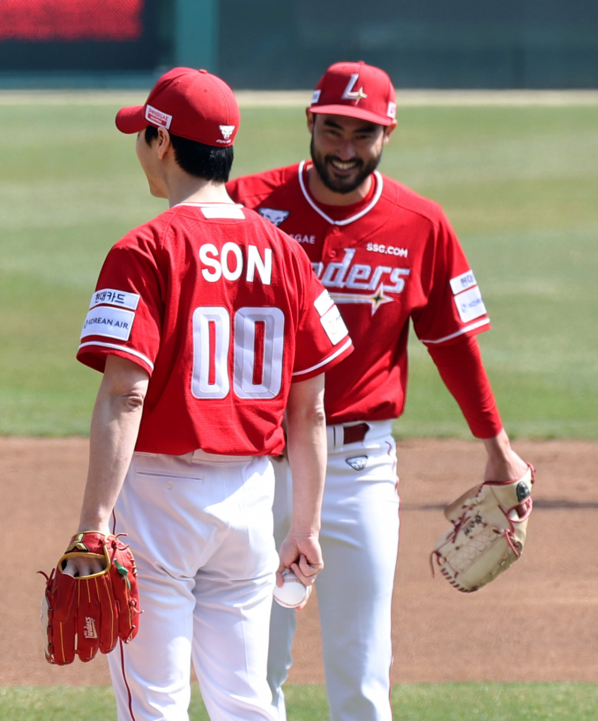 흑백요리사2 손종원 셰프가 28일 인천SSG랜더스필드에서 열리는 2026 프로야구 SSG랜더스와 KIA타이거즈 개막경기에서 마운드 올라 선발투수 화이트에 양해를 구한 후 시구를 하고 있다.