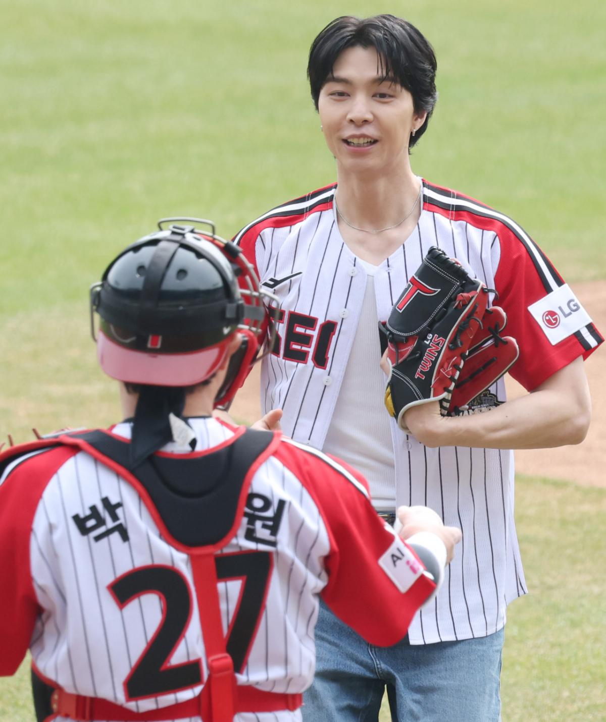 NCT 멤버 쟈니(JOHNNY)가 LG 승리기원 시구를 한 후 포수 박동원에게 공을 건네받고 있다.