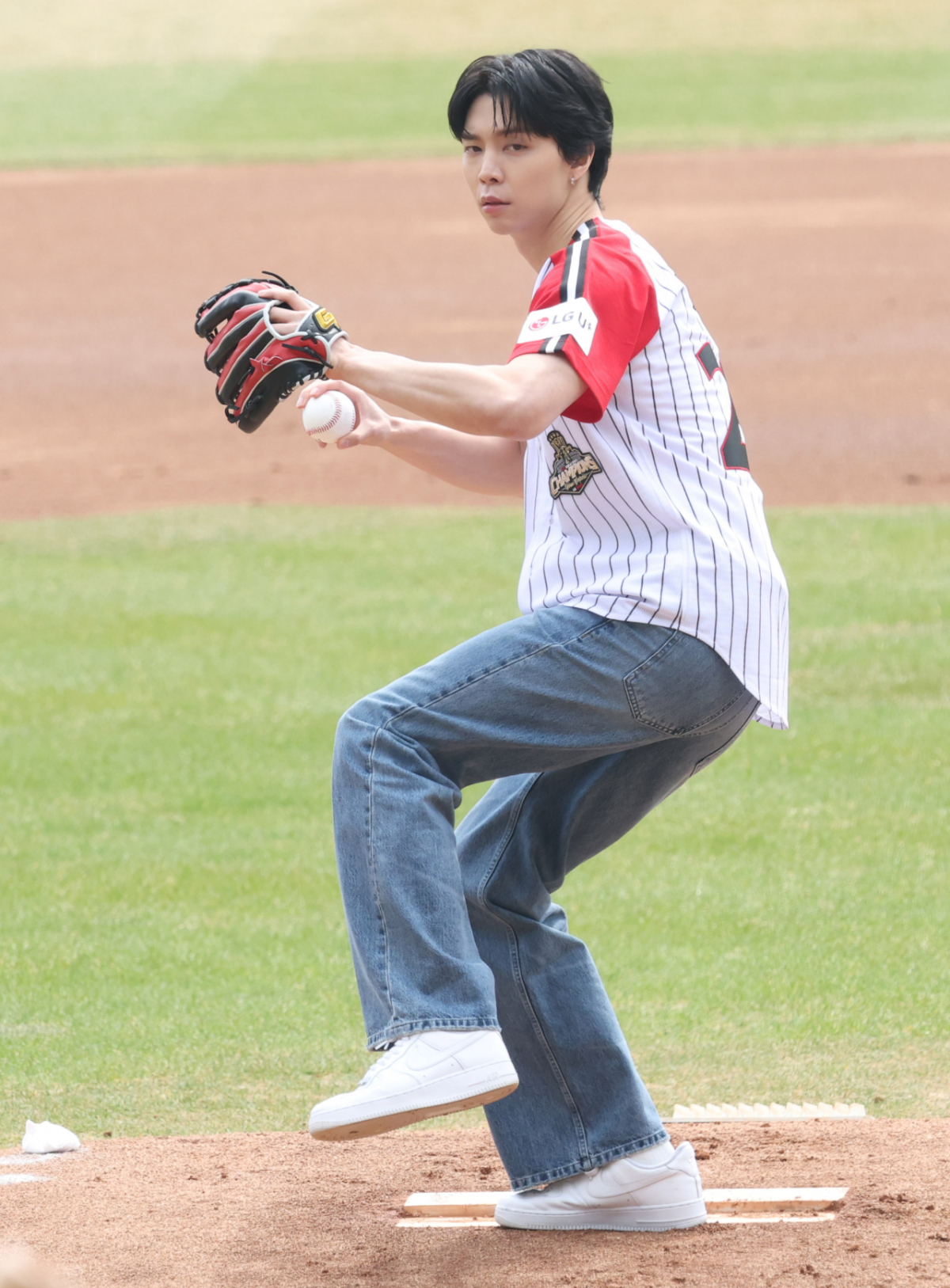 NCT 멤버 쟈니(JOHNNY)가 LG 승리기원 시구를 하고 있다.