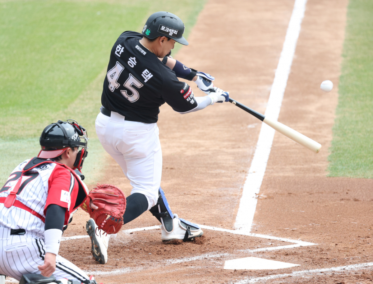 KT 한승택이 호쾌한 타격을 선보이고 있다.