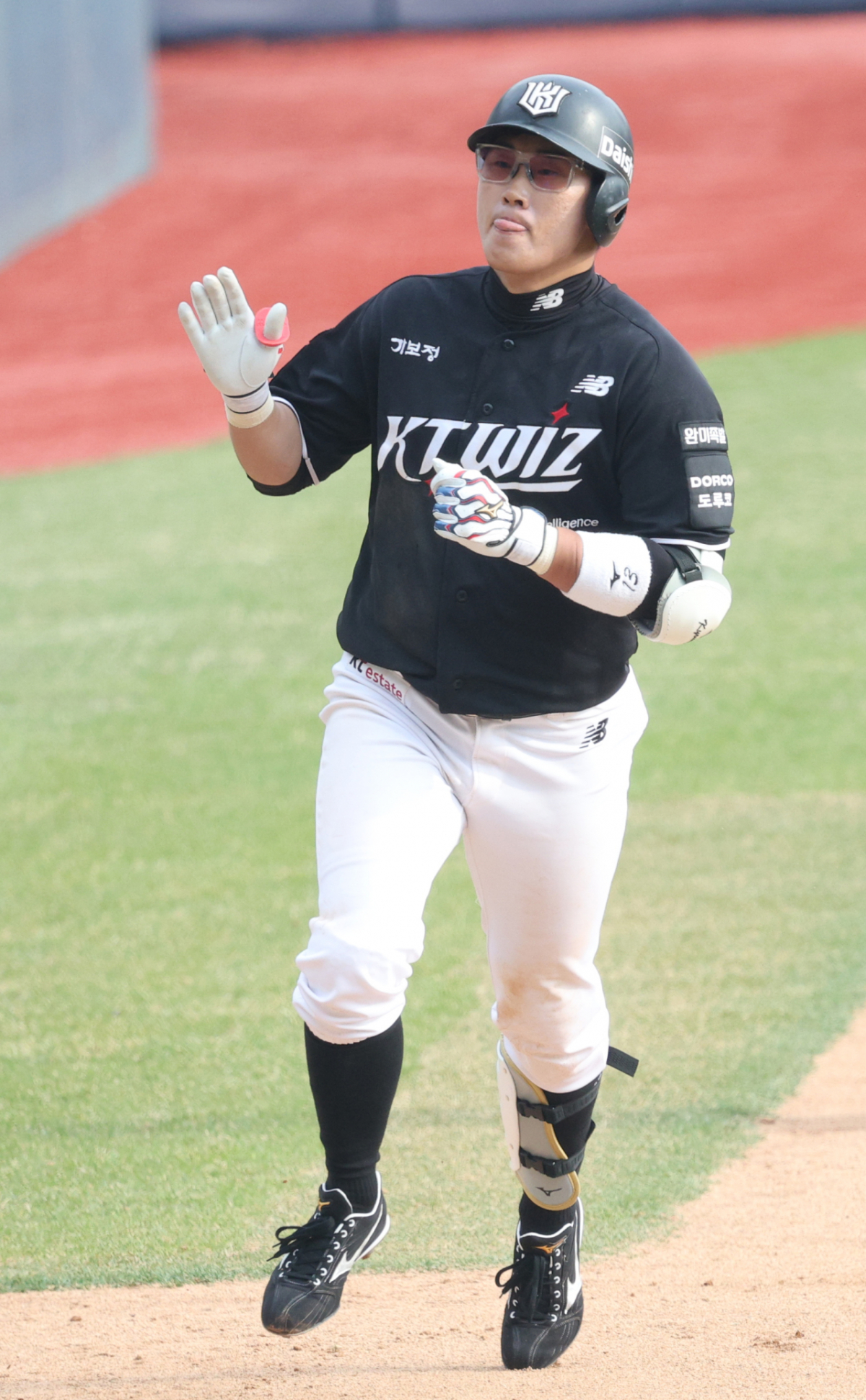 KT 허경민이 6회초 2사 1루에서 LG 김진성을 상대로 동점 좌월 2점 홈런을 날리고 홈인하고 있다.