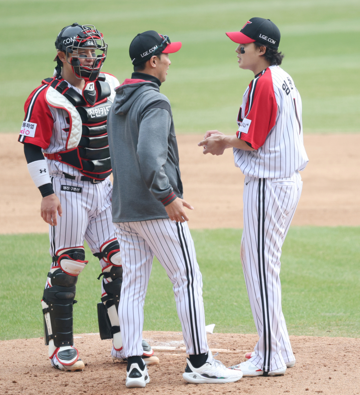 LG 선발 임찬규가 흔들리는 모습을 보이자 김광삼 코치가 마운드로 가 진정시키고 있다.