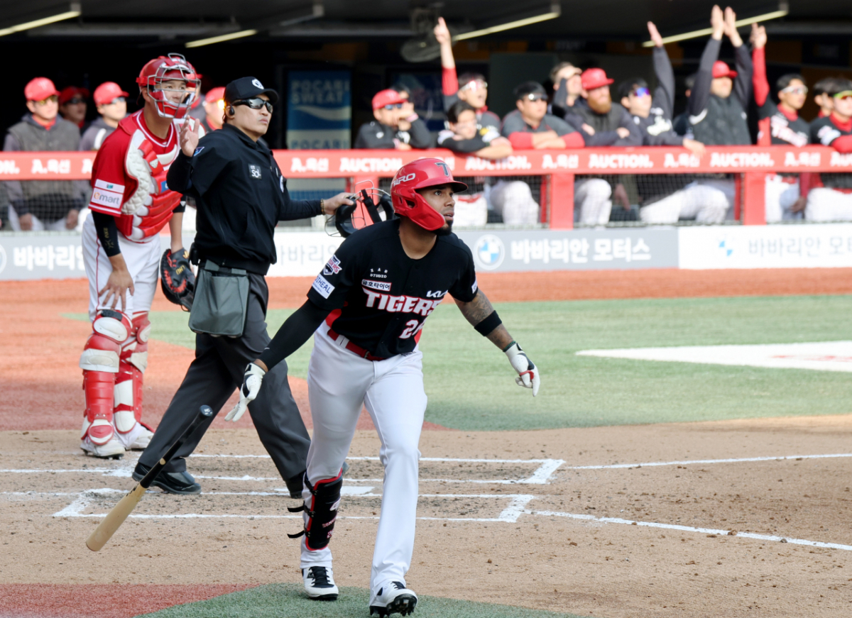 기아 2번타자 카스트로가 29일 인천SSG랜더스필드에서 열리는 2026 프로야구 SSG랜더스와 KIA타이거즈 경기 7회초 2사 1루에서 김택현을 상대로 우월2점홈런을 터트린 후 홈인하고고 있다.. 2026.03.29.