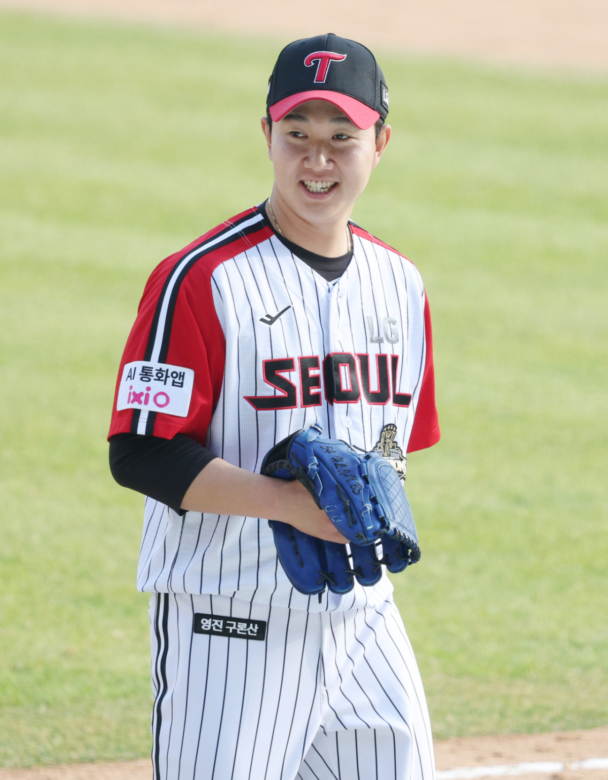 LG 유영찬이 8회말 2사 만루에서 KT 류현인을 삼진으로 돌려세운 후 활짝 웃고 있다.