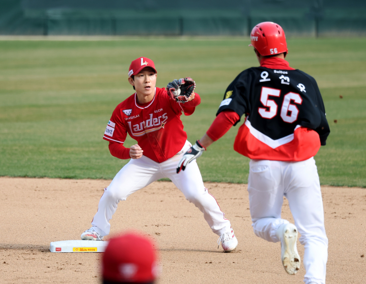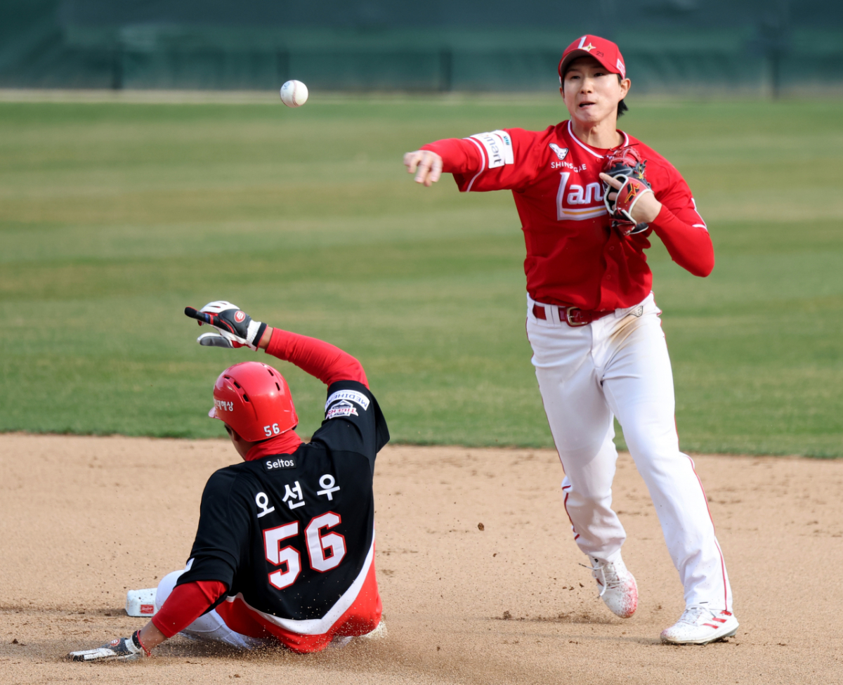 랜더스 박성한이 29일 인천SSG랜더스필드에서 열리는 2026 프로야구 SSG랜더스와 KIA타이거즈 경기 8회초 무사 1루 기아 8번타자 한준수 내야땅볼때 1루주자 오선우를 2루포스아웃시킨 후 1루로 송구하고 있다. 2026.03.29.