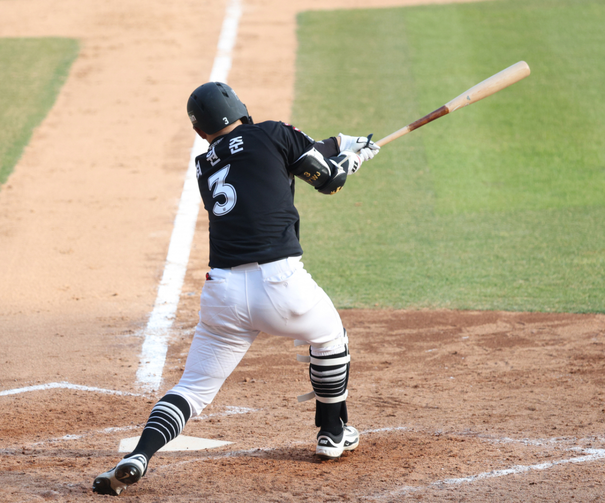KT 최원준이 9회초 무사 1루에서 우전 안타을 날리고 있다.