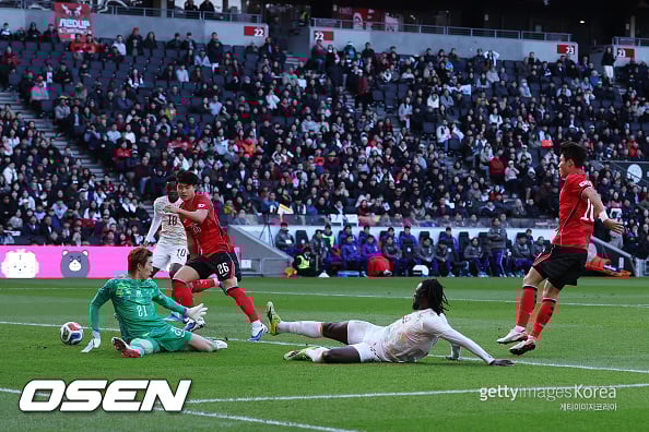 조유민은 또 뚫렸다. 최후방 수비수가 한 번에 벗겨지면서 한국이 계속 실점위기를 맞았다. 전반 추가시간 또다시 같은 장면이 반복됐다. 시몽 아딩그라가 측면에서 조유민을 제쳐내며 슈팅을 시도했다. 공은 그대로 골망을 흔들었다. 전반에만 같은 수비 라인이 두 차례 와르르 무너졌다.