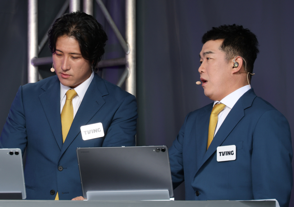 황재균, 정근우 해설위원이 방송 준비를 하고 있다.