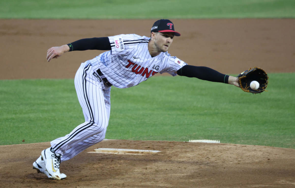 LG 선발 톨허스트가 수비 동작을 취하고 있다.