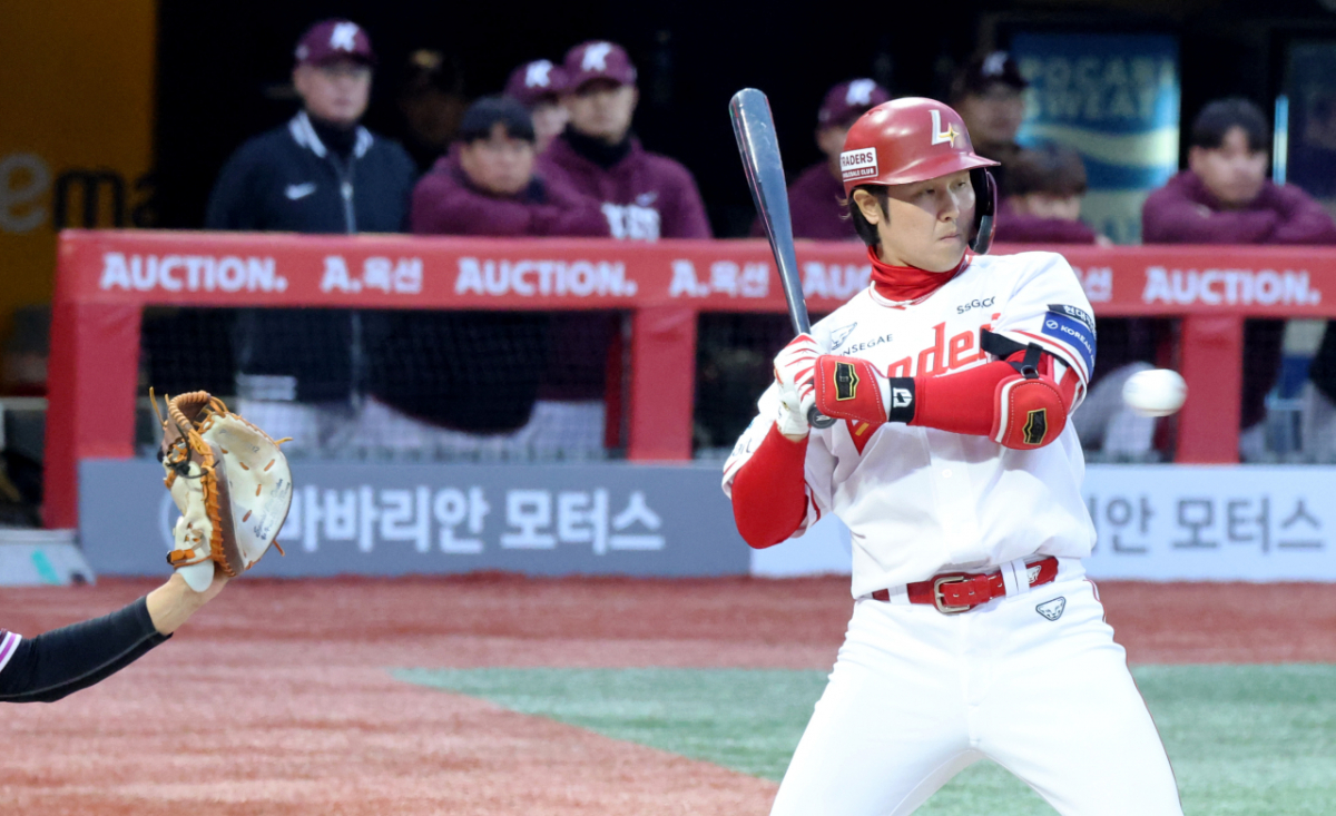 랜더스 3번타자 최정이 31일 인천SSG랜더스필드에서 열리는 2026 프로야구 SSG랜더스와 키움히어로즈의 경기 1회말 몸쪽볼을 피하고 있다. 2026.03.31.