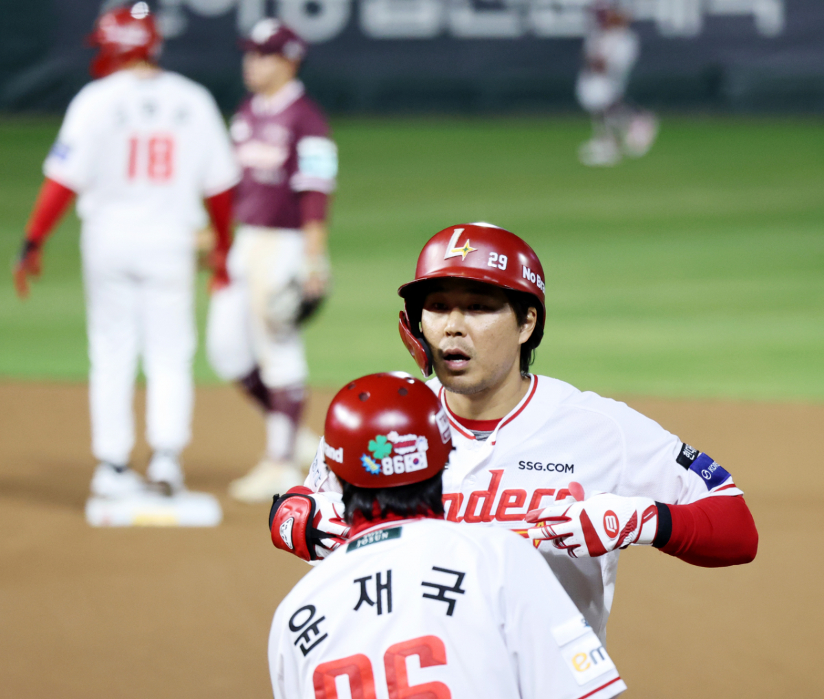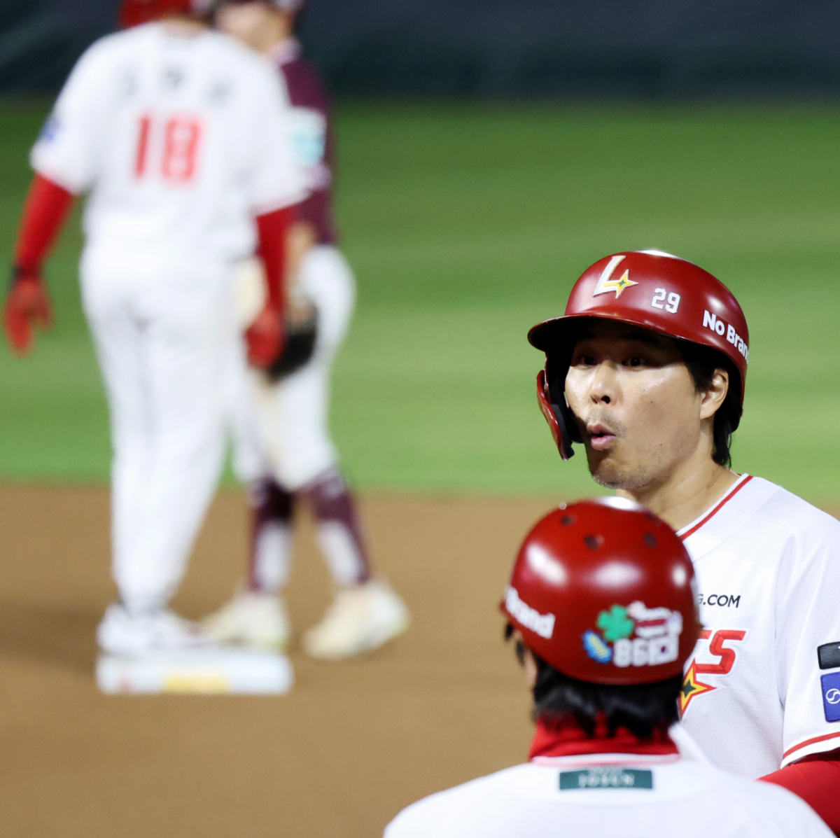 랜더스 6번타자 한유섬이 31일 인천SSG랜더스필드에서 열리는 2026 프로야구 SSG랜더스와 키움히어로즈의 경기 4회말 2사 1루에서 안타로 출루하고 있다. 2026.03.31.