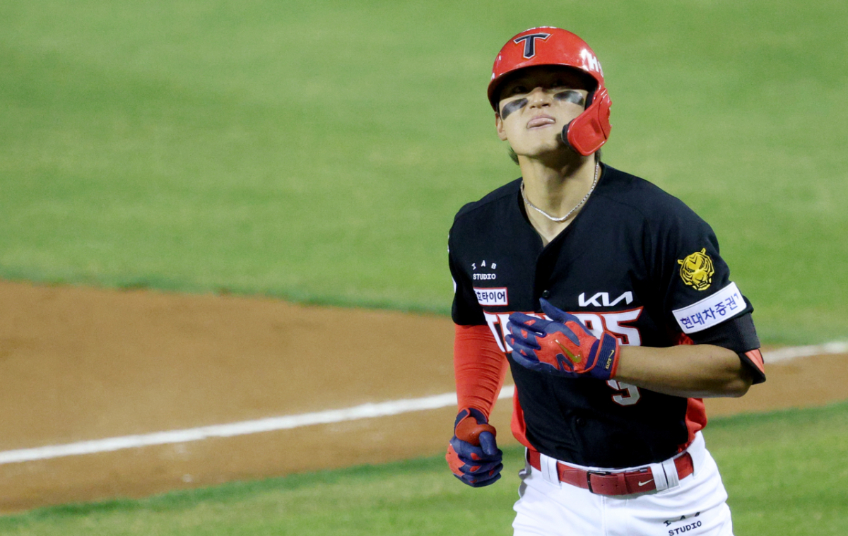 KIA 김도영이 4회초 무사에서 날린 장타가 플라이에 그치자 아쉬워하고 있다.