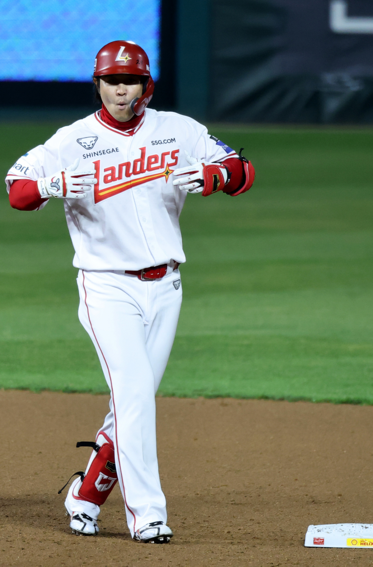 랜더스 3번타자 최정이 31일 인천SSG랜더스필드에서 열리는 2026 프로야구 SSG랜더스와 키움히어로즈의 경기 6회말 무사 1루에서 2루타로 출루하고 있다. 2026.03.31.
